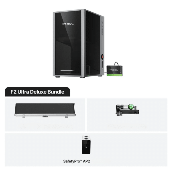 xTool F2 Ultra Dual Deluxe – Laser MOPA 60 W & Diode 40 W avec RA2 Pro, Convoyeur Automatique & Filtration SafetyPro AP2